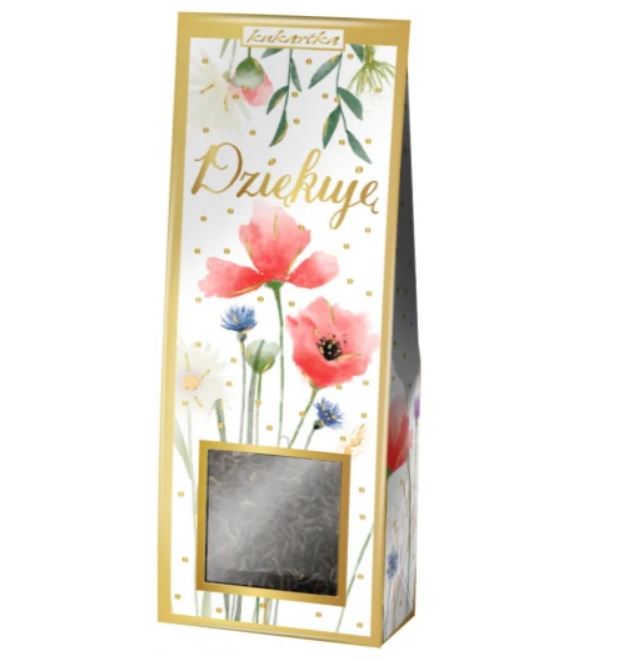 Herbata „Dziękuję” SG-313 to wspaniały pomysł na drobny upominek. 50 gram najwyższej jakości herbaty opakowane jest w piękny, zdobiony metaliczną folią kartonik. Cechy szczególne: – wyjątkowe kolorowe, opakowanie – super jakości herbata – 50 gr – Wymiary 18,5 x 7 x 4 cm, – smak: Zielony Raj – herbata zielona Sencha ,skórka pomarańczy, jabłko, ananas, płatki róży, płatki hibiskusa, aromat